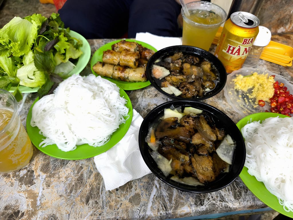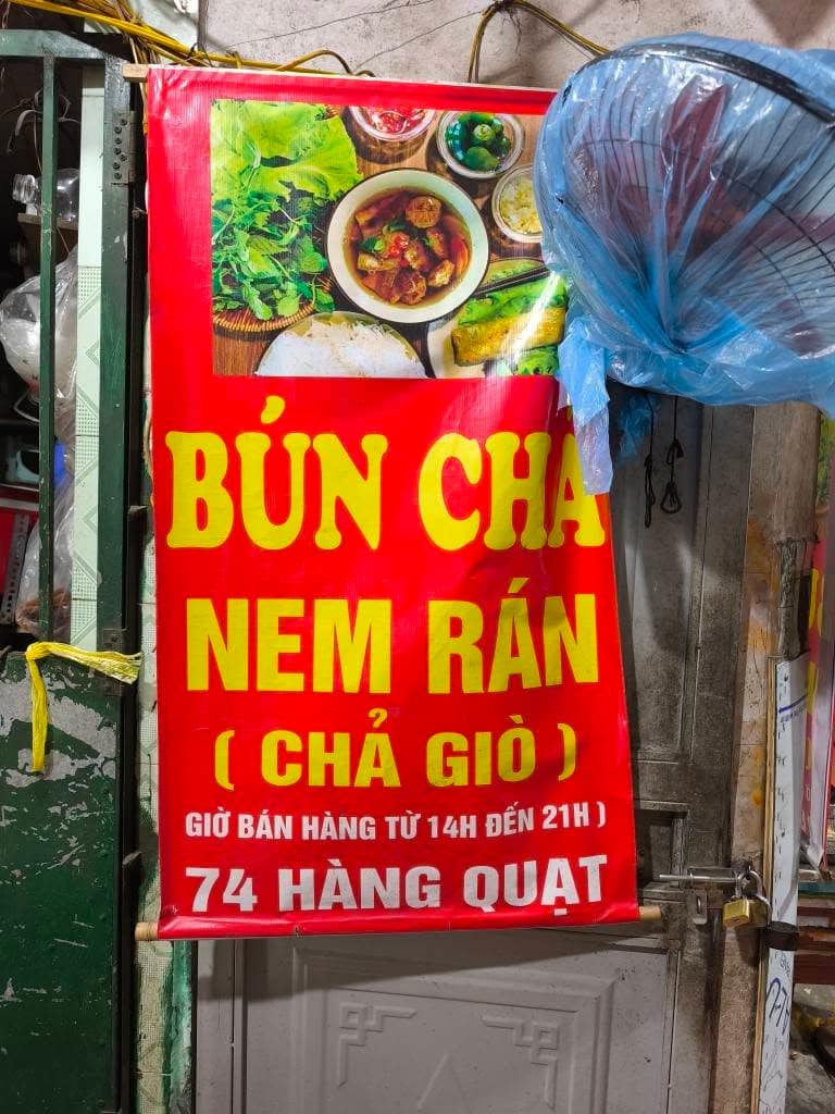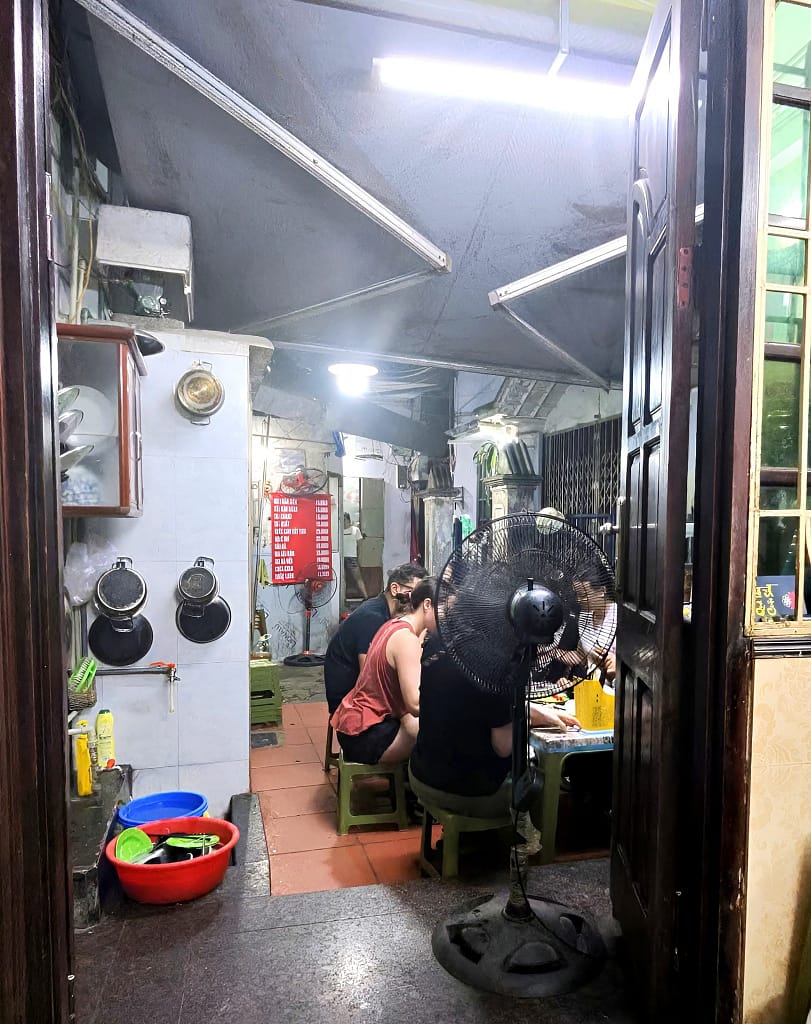 L’endroit où a été prise cette photo sert l’un des meilleurs bún chả que l’on puisse trouver à Hanoï , et peut-être dans le cadre le plus pittoresque pour ce type de plat. Niché au fond d’une petite cour, à l’extrémité d’une longue allée étroite, l’espace est partagé par trois familles, chacune tenant son petit commerce. L’une prépare le bún chả, une autre sert des nem et du thé glacé, tandis que la troisième propose diverses boissons.