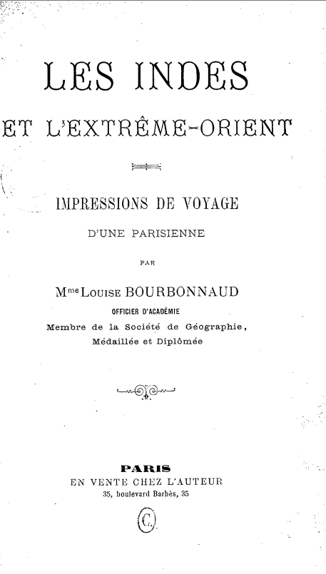 Louise Bourbonnaud, Les Indes et l’Extrême-Orient. Impressions de voyage d’une Parisienne, 1888. Disponible à la Bibliothèque nationale de France.